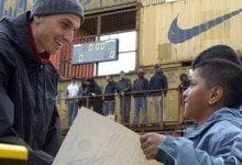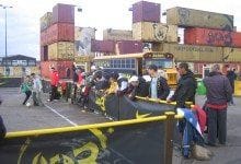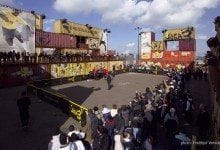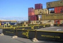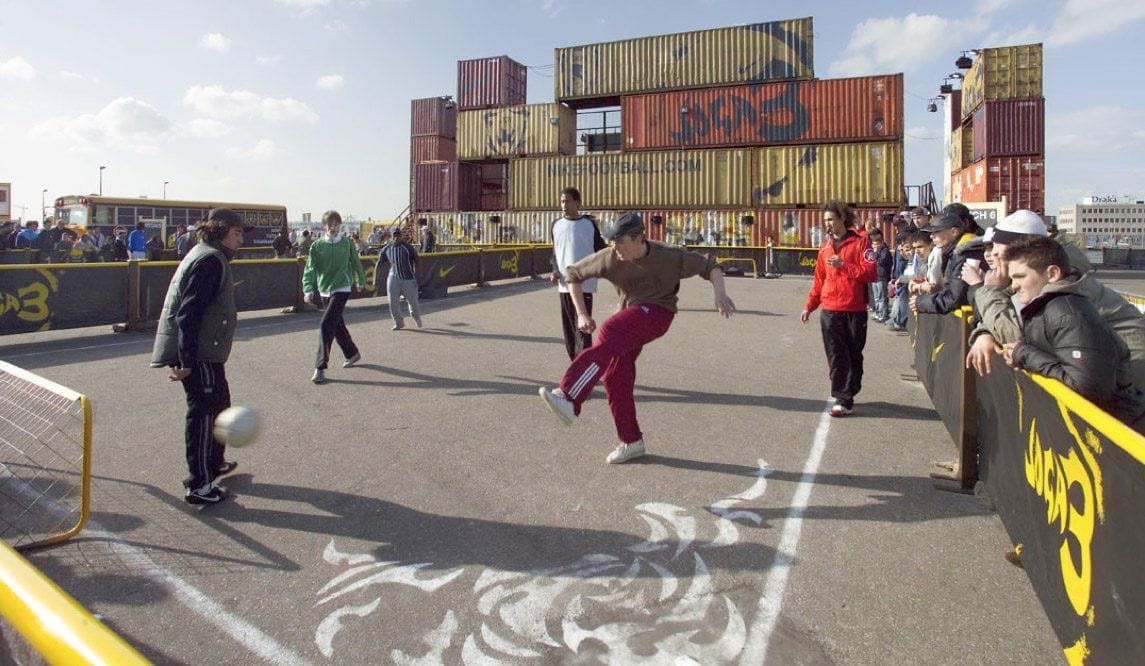 Nike organised a 3-on-3 soccer tournament around the World Cup 2006. The ad campaign was called Joga Bonita – play beautiful – inspired by Brazilian street soccer. We created an event setting in Amsterdam to host the tournament games and finals in line with the theme and the Brazilian street culture: a stadium built from sea containers. Teams play on the pitches outside of the stadium, the winners get to play in the Joga3 Arena. We designed the interiors of school buses to function as retail showrooms. Thousands of kids participated in this Joga Bonito contest .